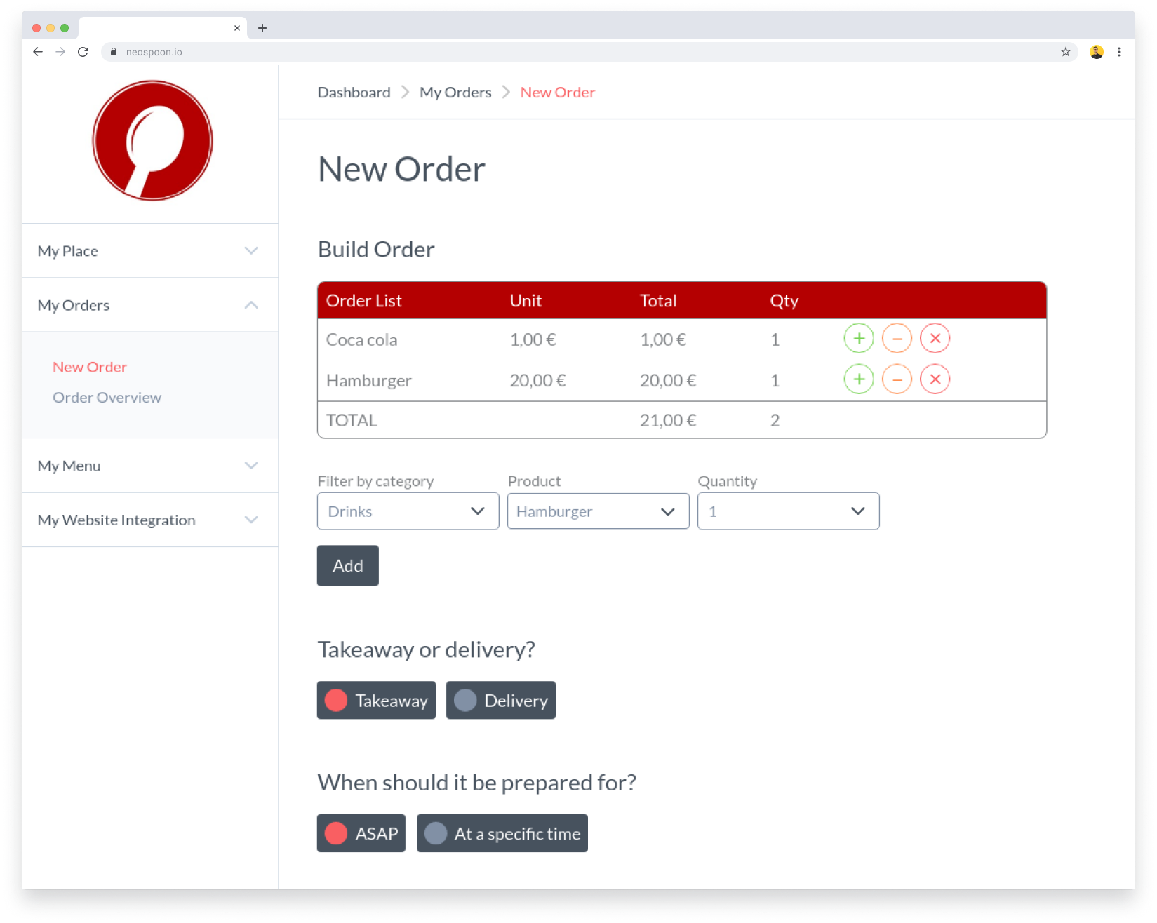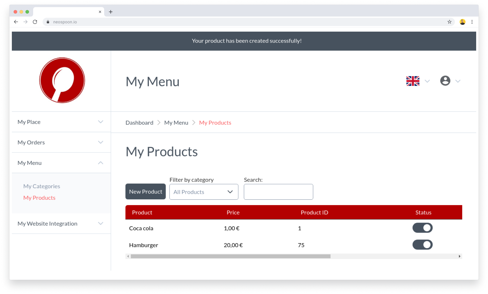 Using neospoon.io, restaurants can take full control of their menu. Restaurant owners are able to fully recreate any menu by adding Products, and creating Categories to organize their products.